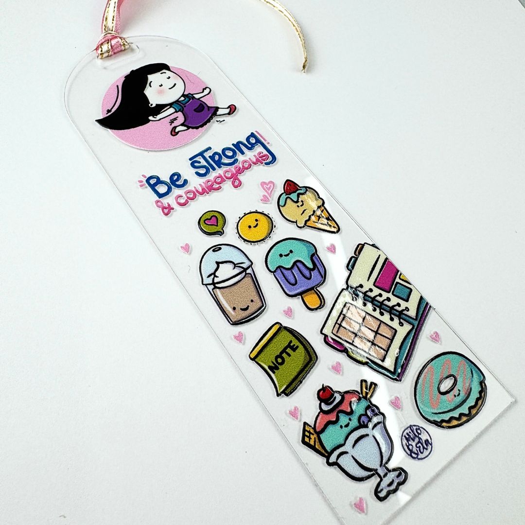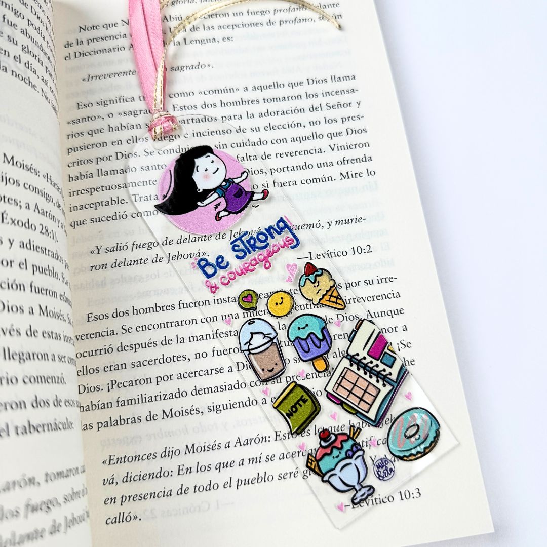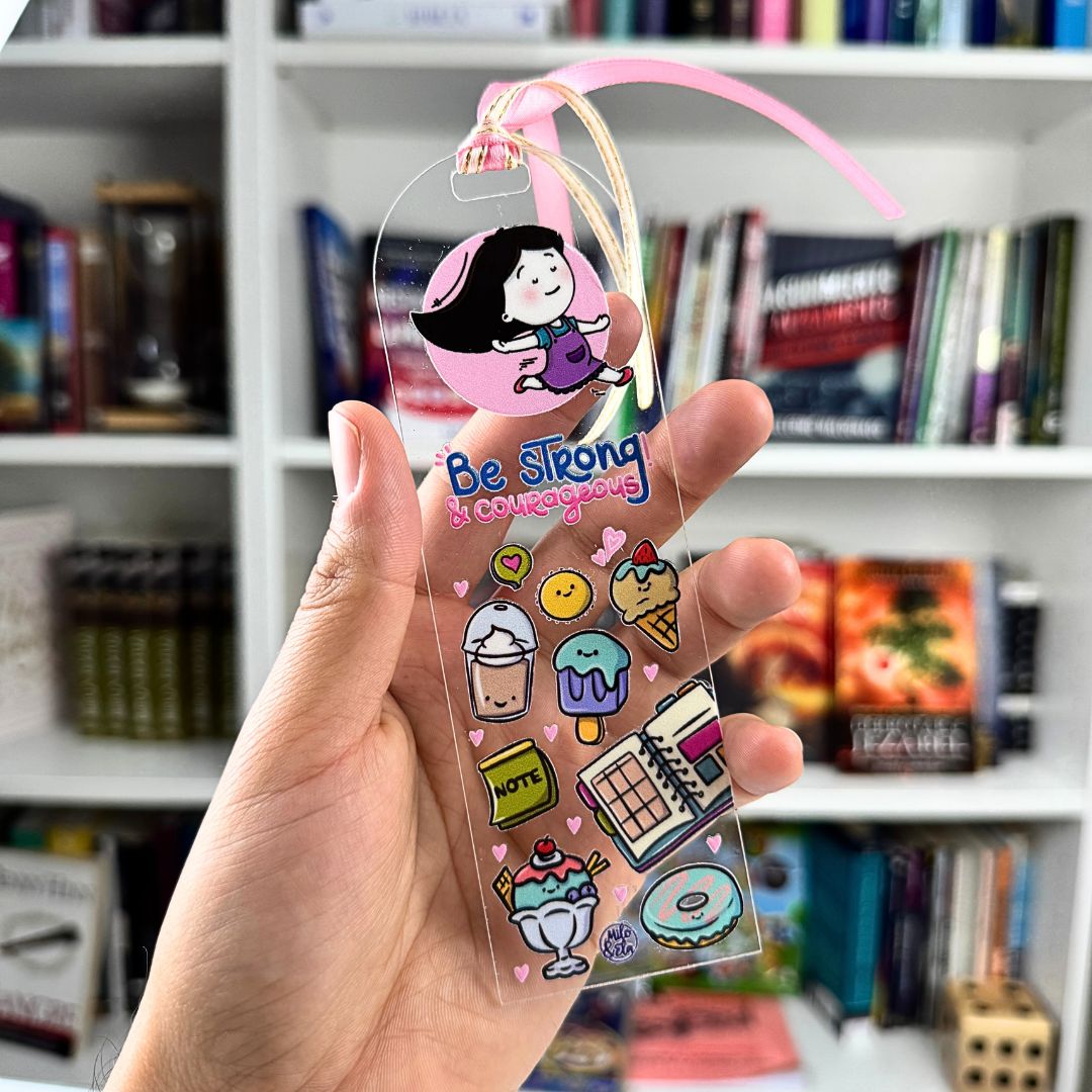 Este separador para libros es una invitaciĂłn diaria a avanzar con valentĂa y alegrĂa. Su diseño en acrĂlico transparente combina una ilustraciĂłn tierna, colores suaves y divertidos Ăconos que representan pequeños momentos felices, junto al mensaje inspirador âBe Strong & Courageousâ.