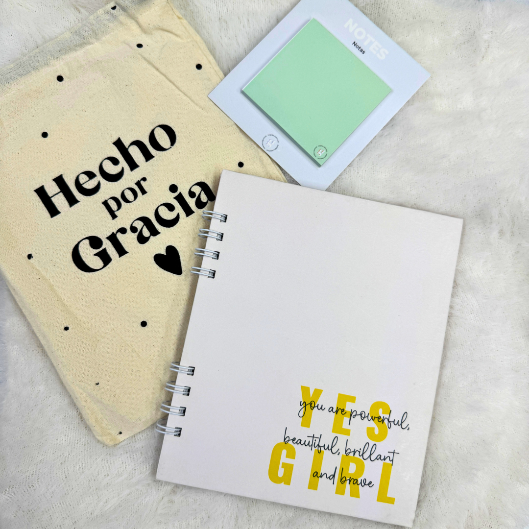 El cuaderno incluye hojas cuadriculadas, ideales para tomar notas, planear, dibujar esquemas o llevar tu bitácora personal. Viene acompañado de un block de notas perfecto para recordatorios rápidos, listas o pensamientos espontáneos, y todo se presenta en una tula de tela de la marca Gracia diseño creativo, que protege y da un toque especial al conjunto.