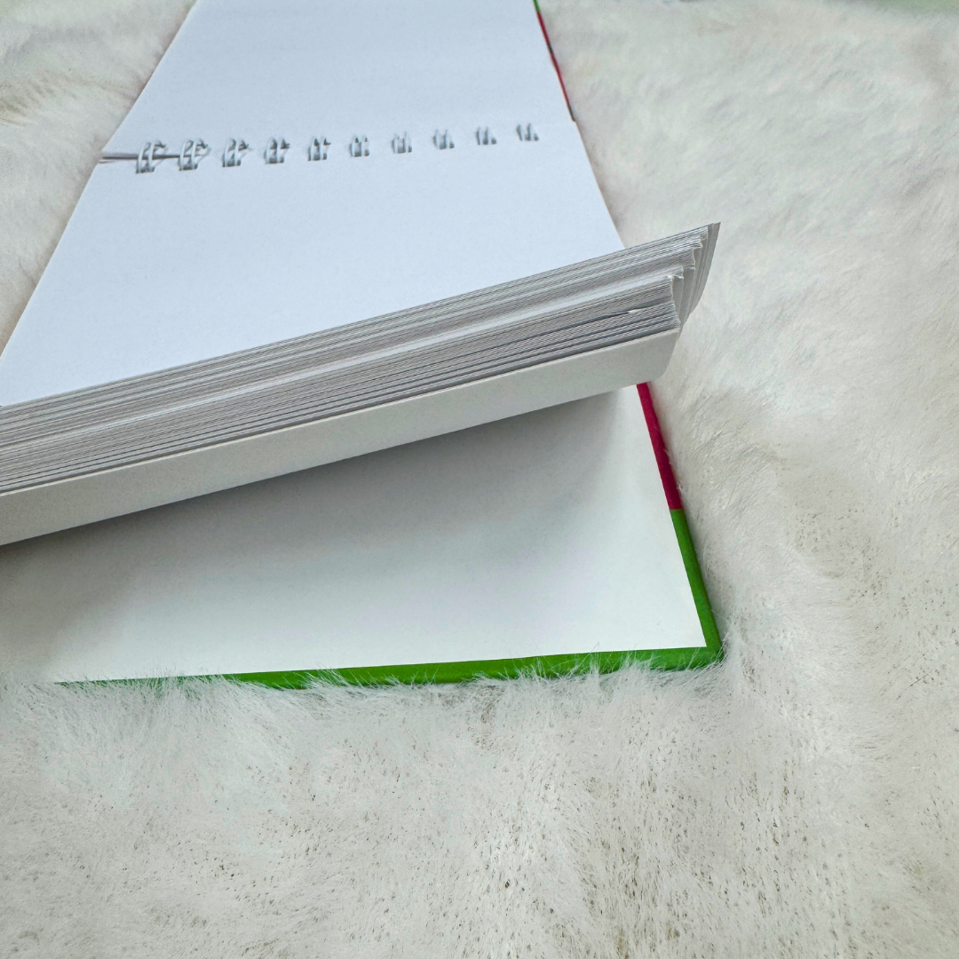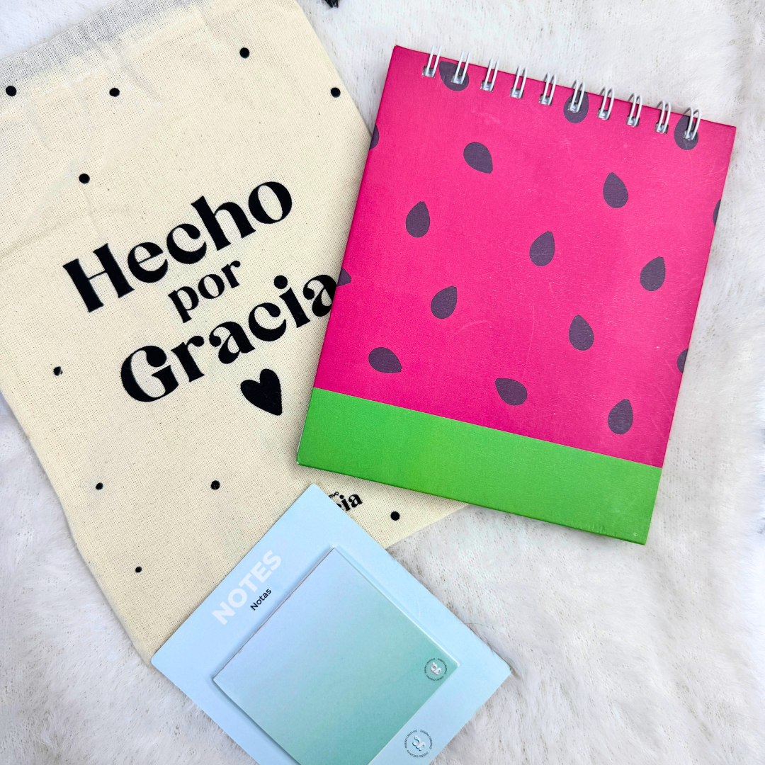 Incluye un cuaderno de bitácora de papel blanco ideal para escribir o ilustrar, acompañado de un block de notas perfecto para recordatorios rápidos, listas o pensamientos espontáneos. Todo viene cuidadosamente presentado en una tula de tela de la marca Gracia diseño creativo, con un mensaje que inspira: Hecho por Gracia 🤍