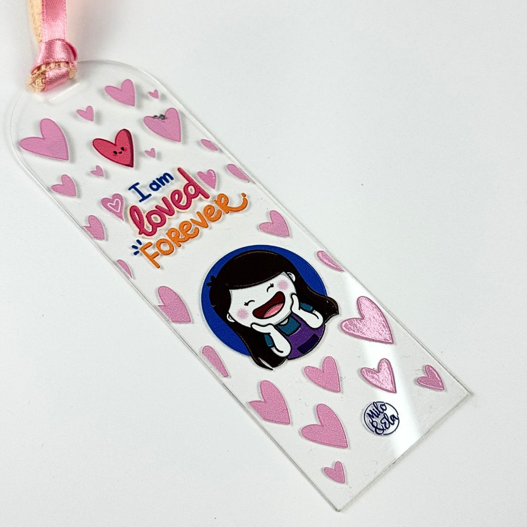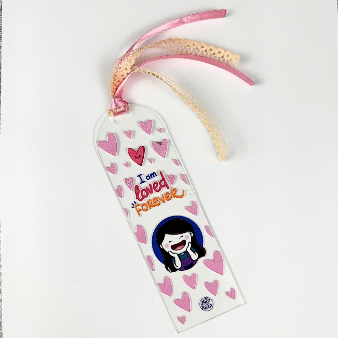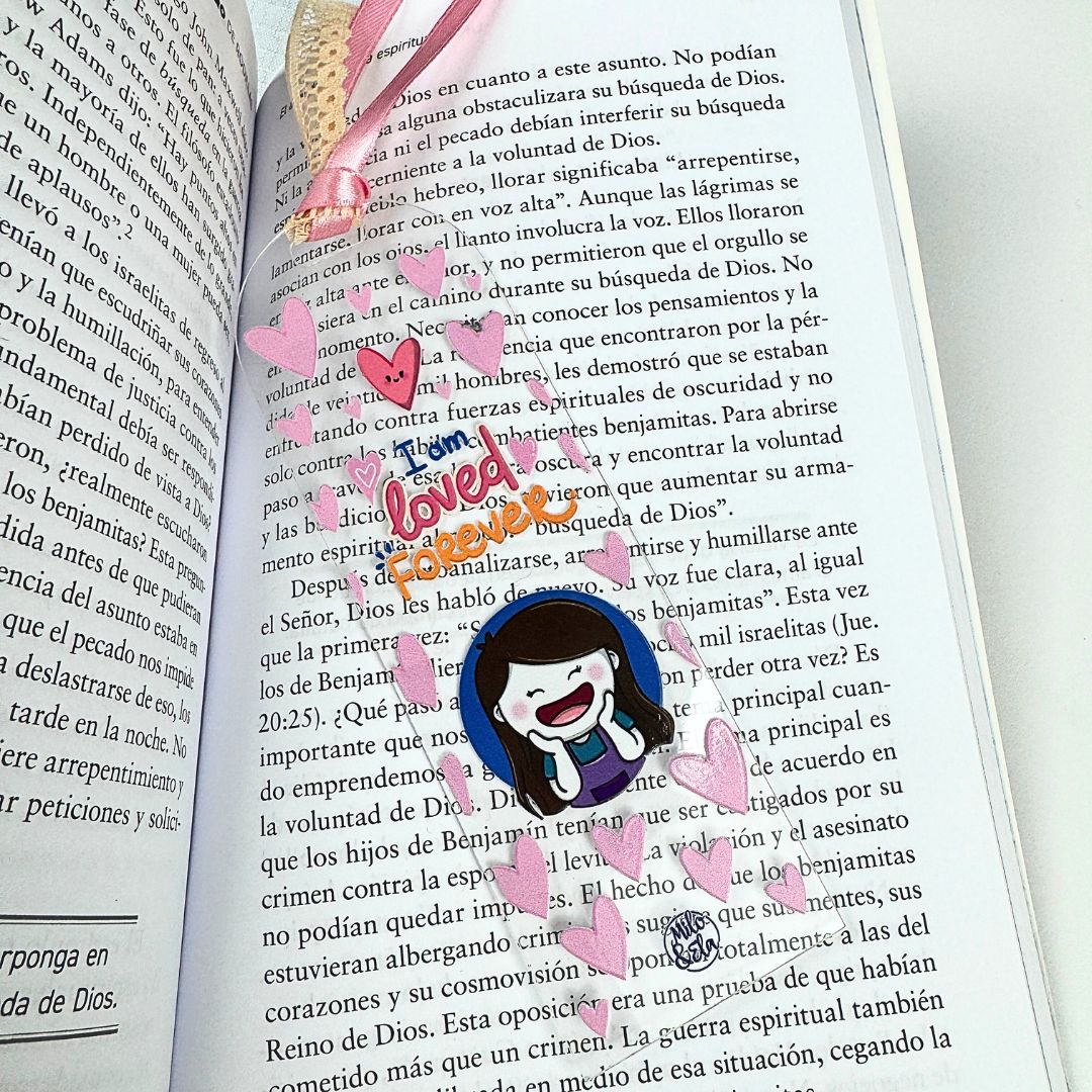 Este hermoso separador para libros es un recordatorio constante de amor, valor y alegría en cada lectura. Su diseño transparente en acrílico, decorado con corazones en tonos rosados, ilustración tierna y el mensaje “I am loved forever”, lo convierten en un detalle especial que acompaña tus momentos de lectura con dulzura y propósito.
