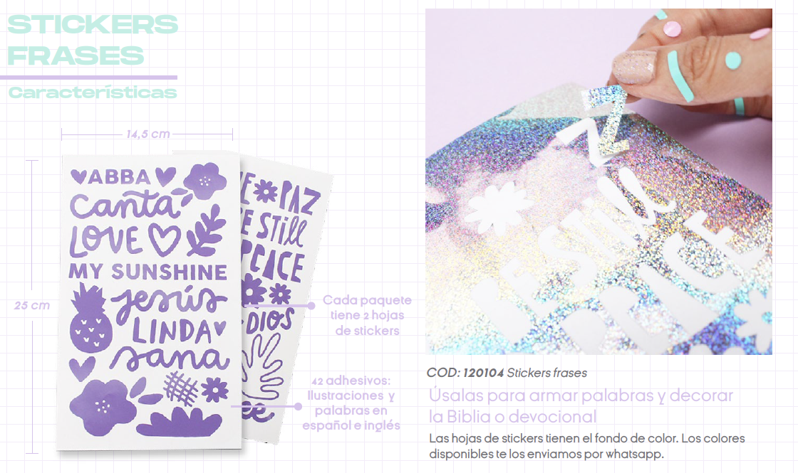 ¡Exprésalo con palabras que inspiran! Este set contiene frases y palabras en español e inglés que te acompañarán en tus momentos de journaling, decoración bíblica o tiempos creativos con Dios.