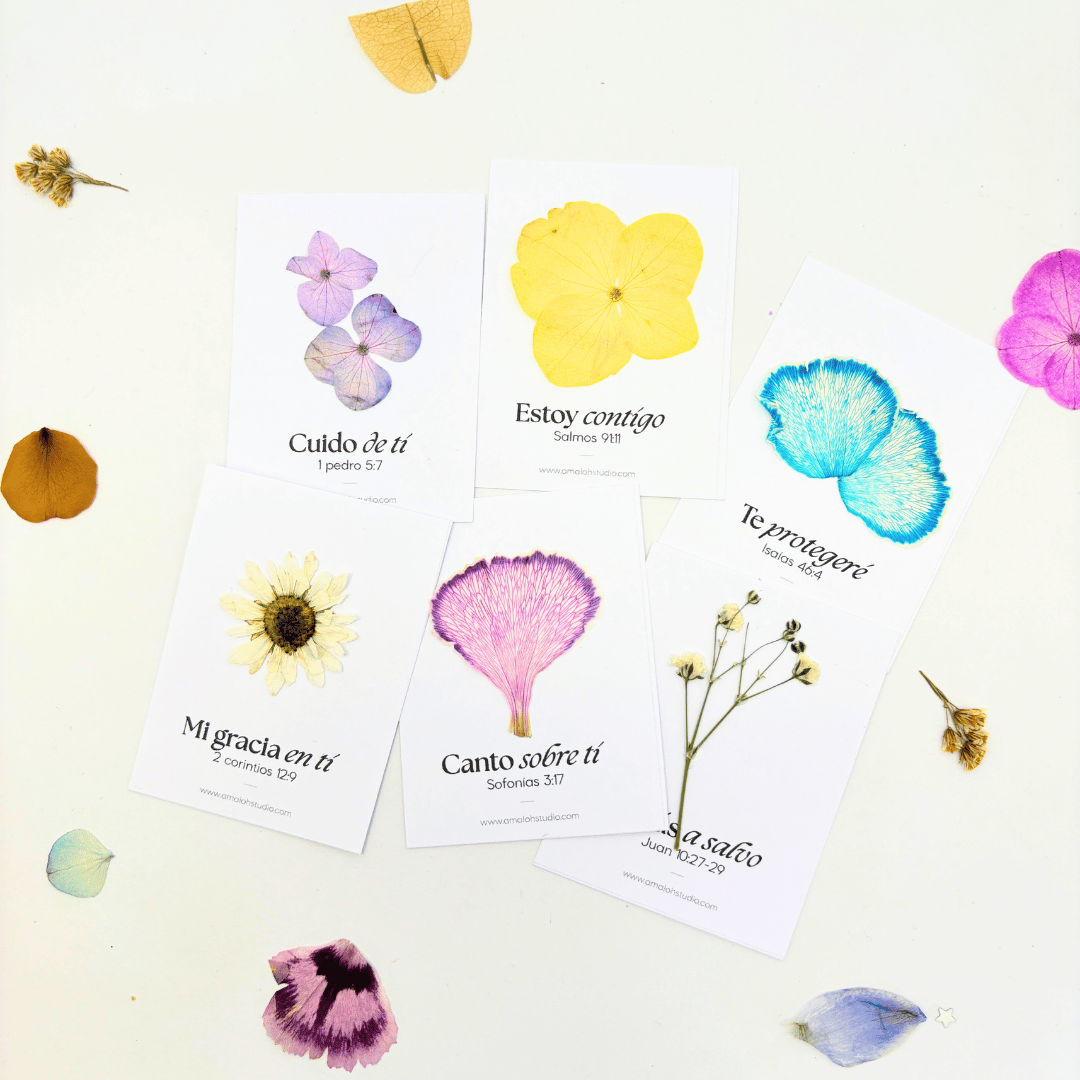 Haz que cada día comience con una promesa de Dios. Este set incluye 7 promesas bíblicas con flores prensadas reales sobre tarjetas impresas en opalina de 180g. Son perfectas para regalar, acompañar una carta, decorar tu Biblia o colocar en tu rincón de oración. 🌿✨