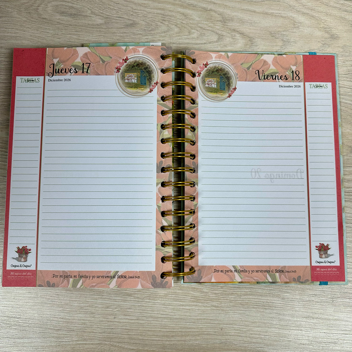 Disponible en dos portadas adorables, esta agenda incluye un calendario 2026 y 2027, hojas para datos personales, fechas importantes, notas, recetas, listas de mercado y viajes, ¡y mucho más! Cada mes te sorprenderá con una portada ilustrada especialmente con ovejitas, un planificador mensual y una hoja para reflexionar, escribir y orar, todo acompañado con un versículo inspirador. 🕊️📆