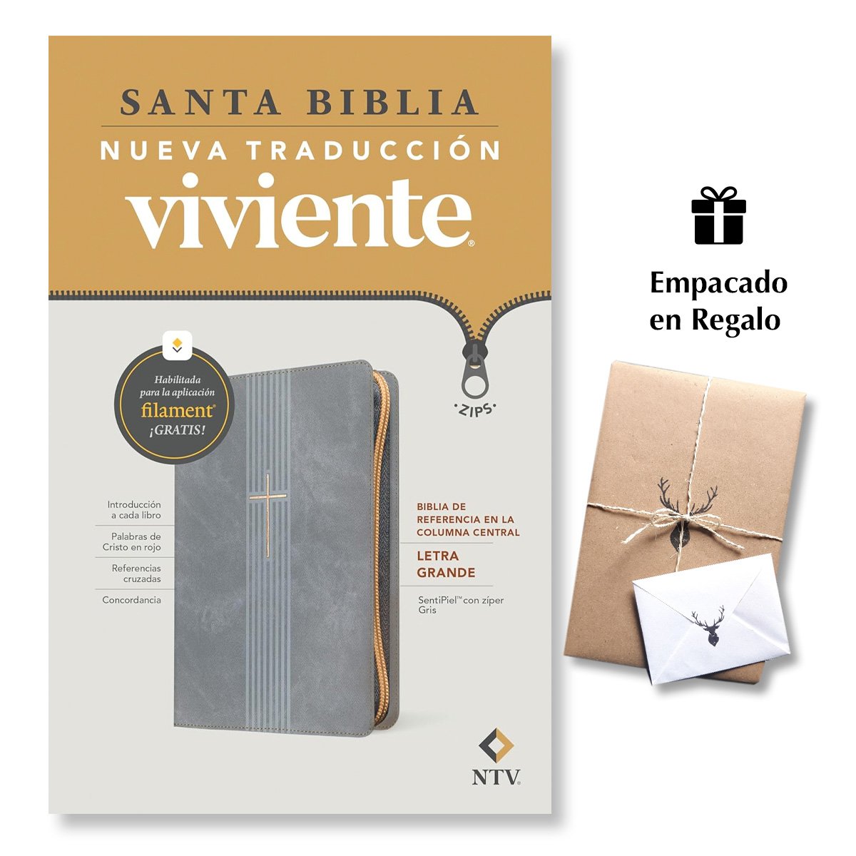 Biblia de referencia en la columna central NTV Letra Grande de zíper con Filament Gris