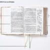 -Encuentra aún mayor belleza en la Palabra de Dios mientras descubres la sabiduría que te sostendrá en cada temporada. Déjate llevar por el esplendor de la Palabra de Dios con el bello y exclusivo arte de los versos ilustrados y las imágenes alentadoras que complementan las Escrituras. Mientras reflexionas, llena los amplios márgenes de esta Biblia con tus pensamientos, diarios y obras de arte para colorear.