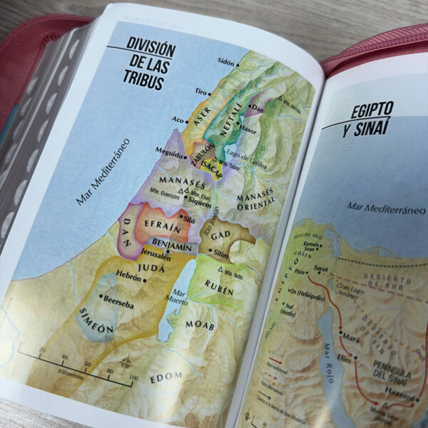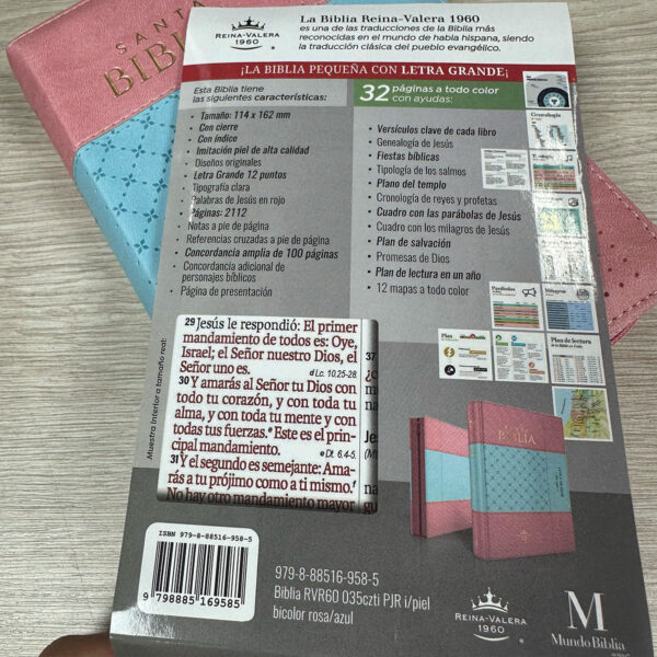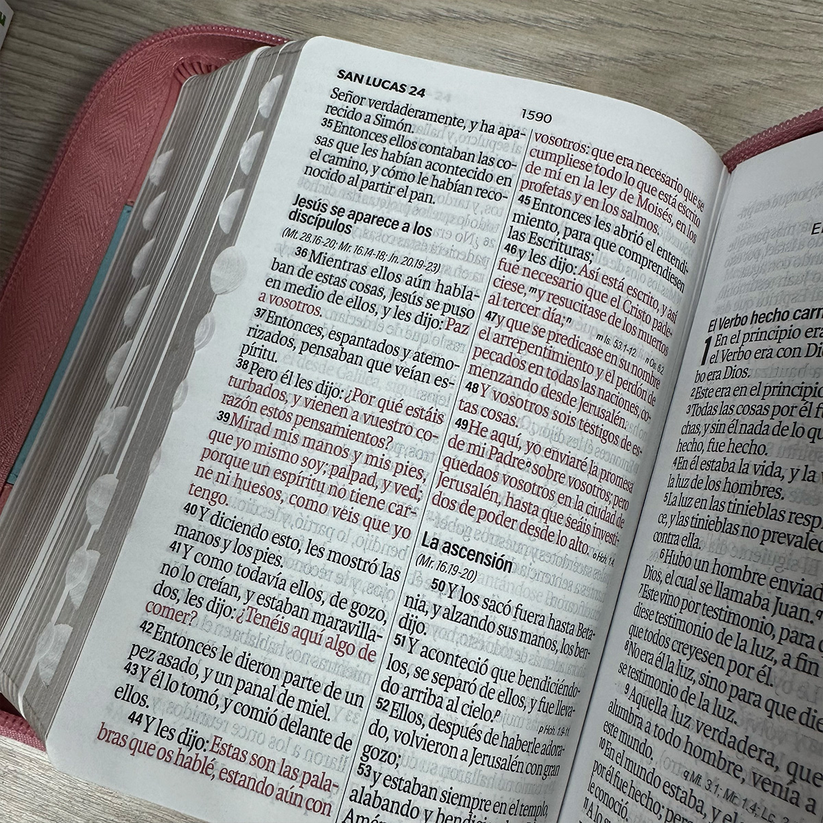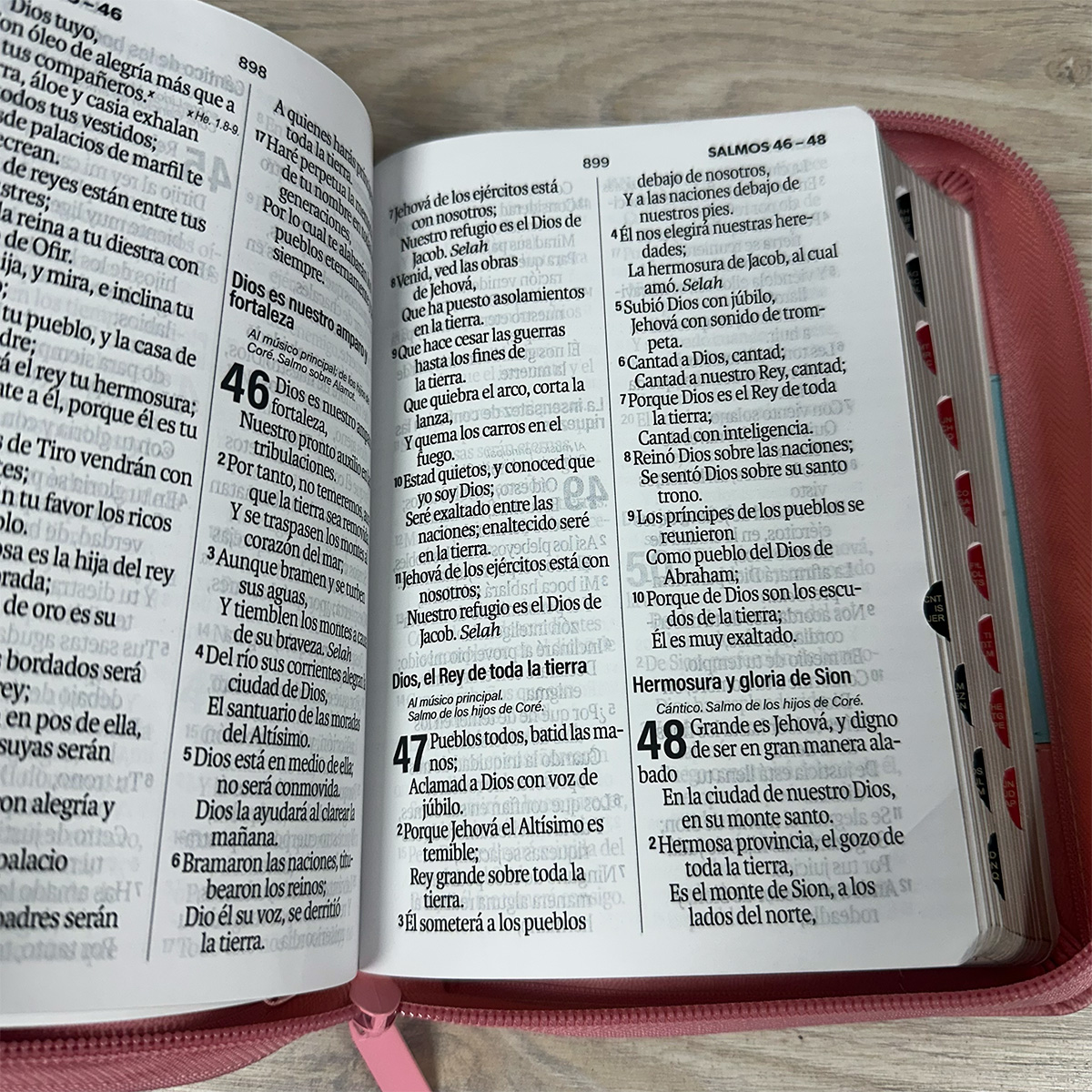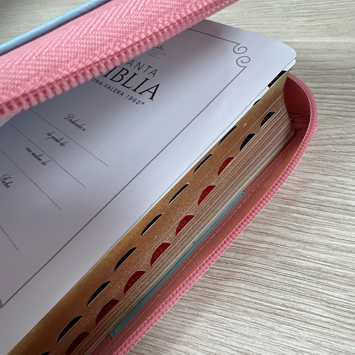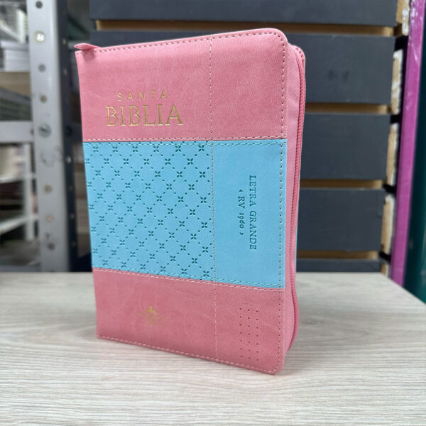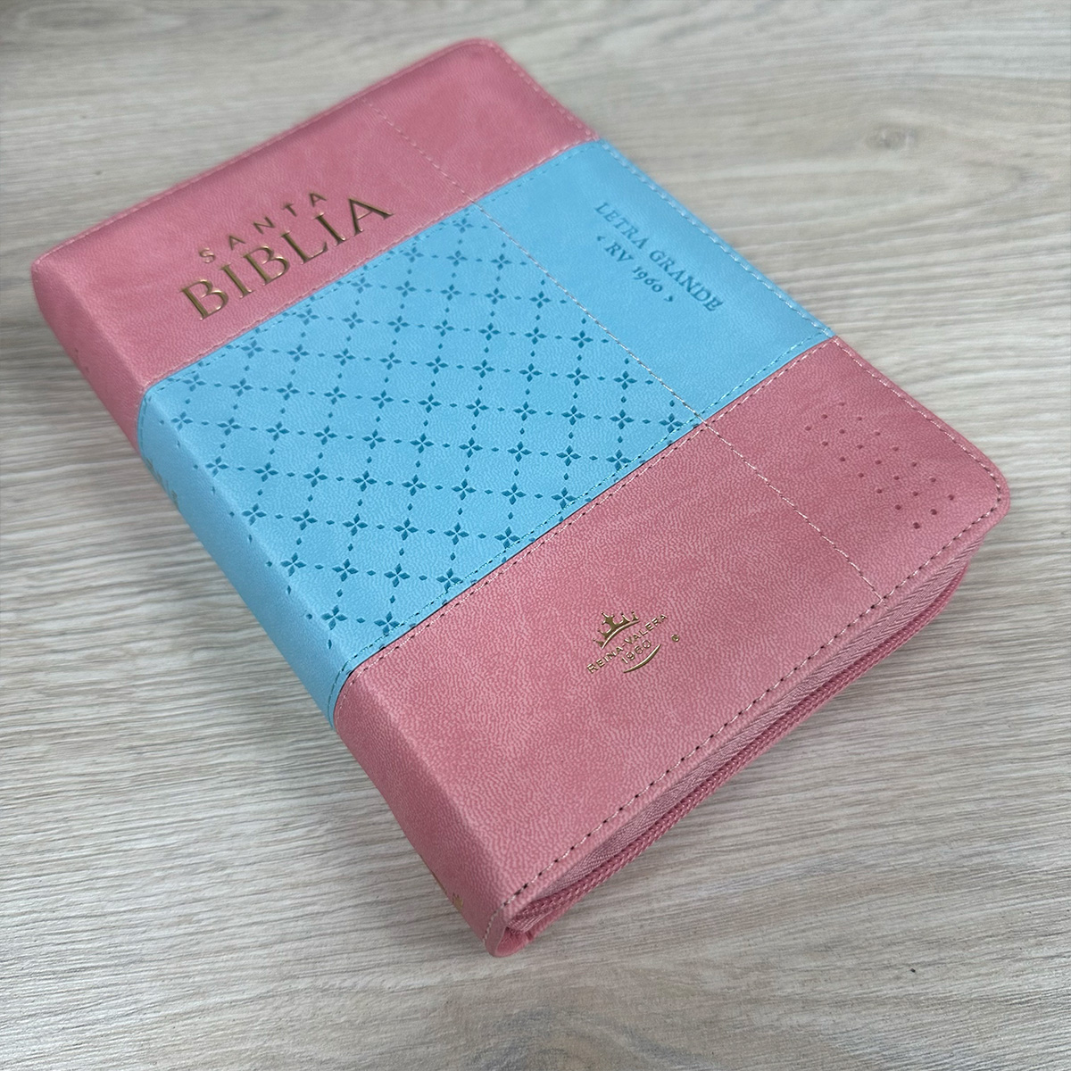 Biblia Letra Grande con Cierre Portátil 12 puntos RV1960, imit piel rosa y azul con índice 16×12 cm