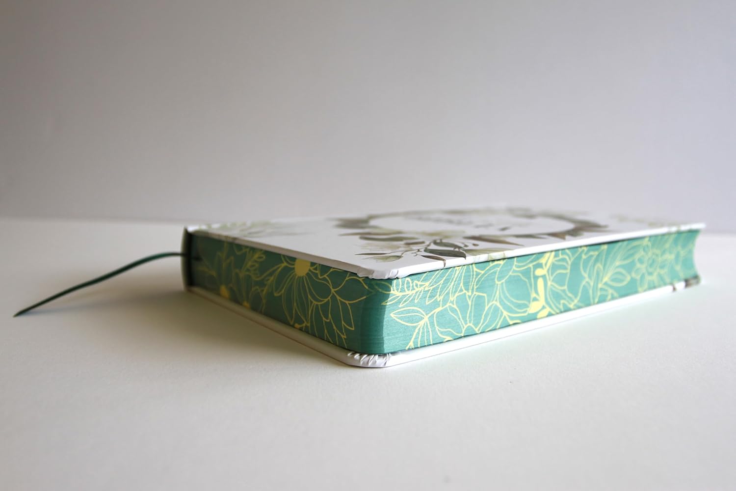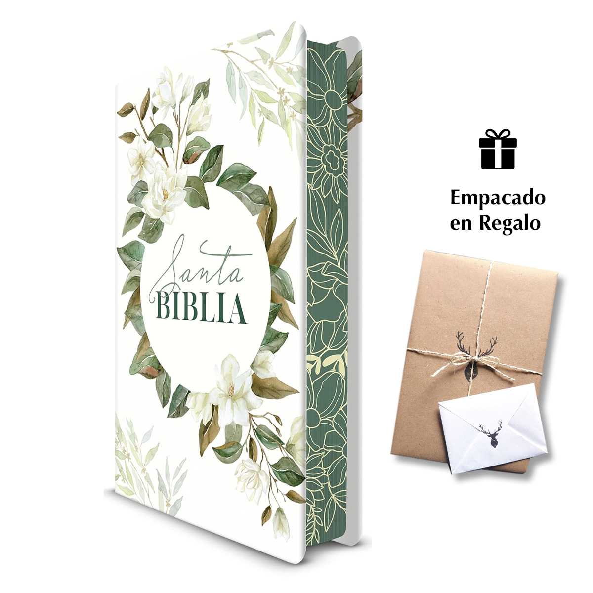 Biblia tamaño manual, ultrafina y con letra grande. Tapa dura con flores blancas, cinta marcadora, y estudio conciso de los nombres de Dios.