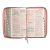 Reina Valera 1960, tamaño manual (138×212 mm), imitación piel bitono, canto dorado, con cierre y con índice, palabras de Jesús en rojo, concordancia , Concordancia de personajes bíblicos. ayudas, referencias cruzadas. 32 páginas a todo color con ayudas y esquemas. 12 mapas a todo color .Letra 12 puntos.