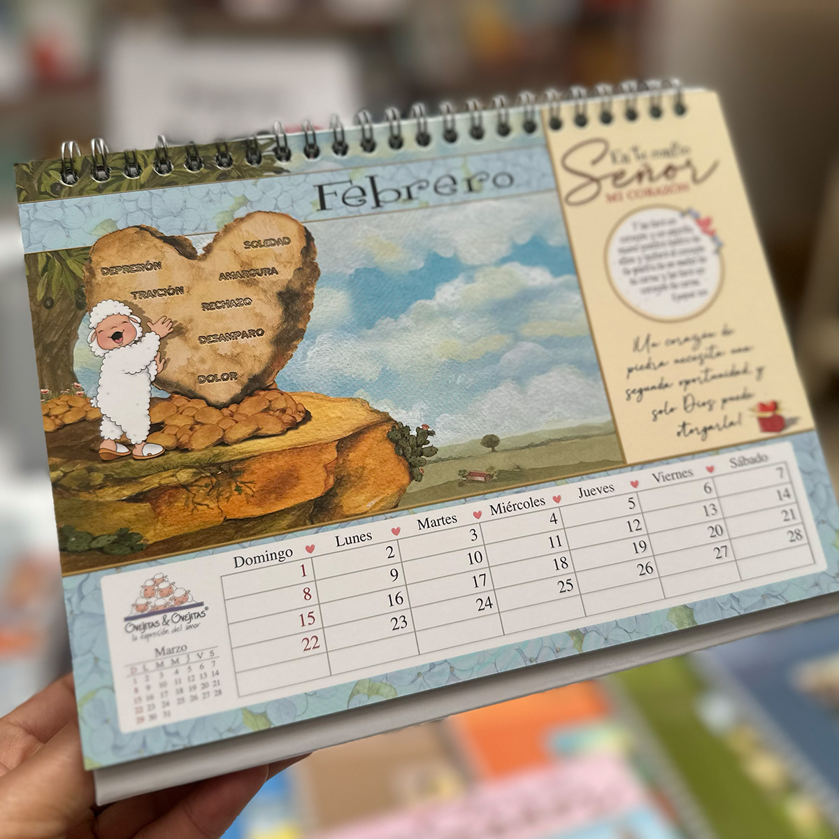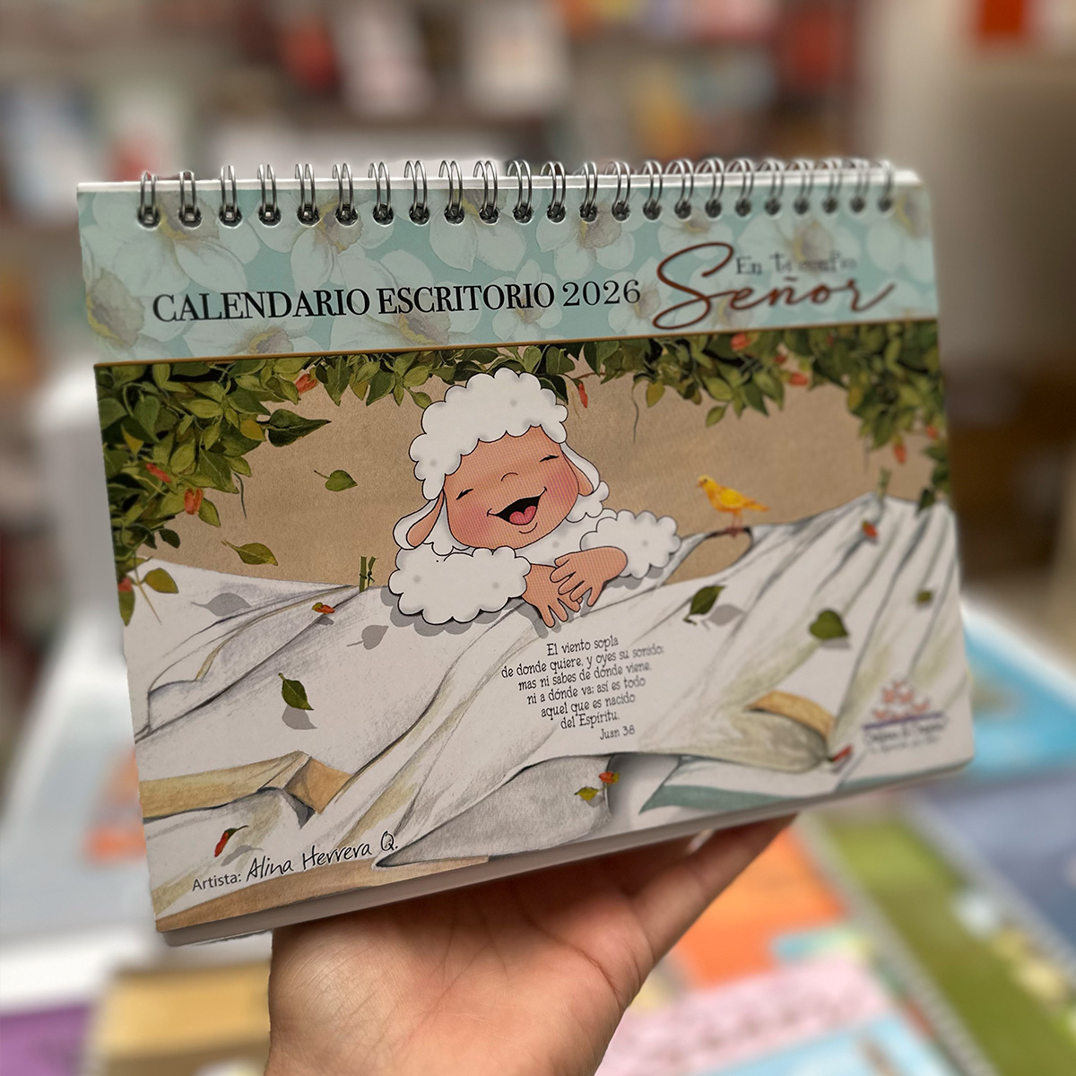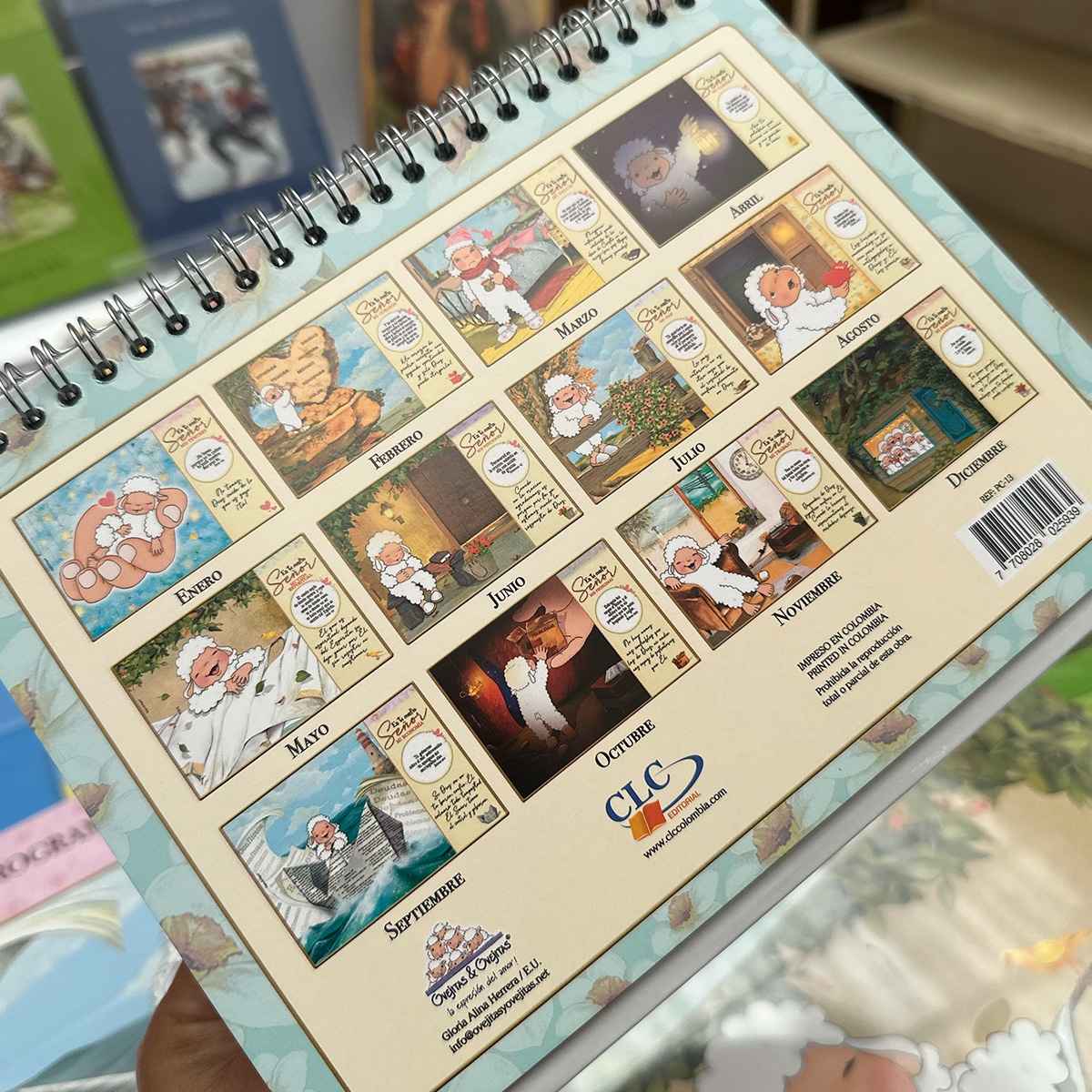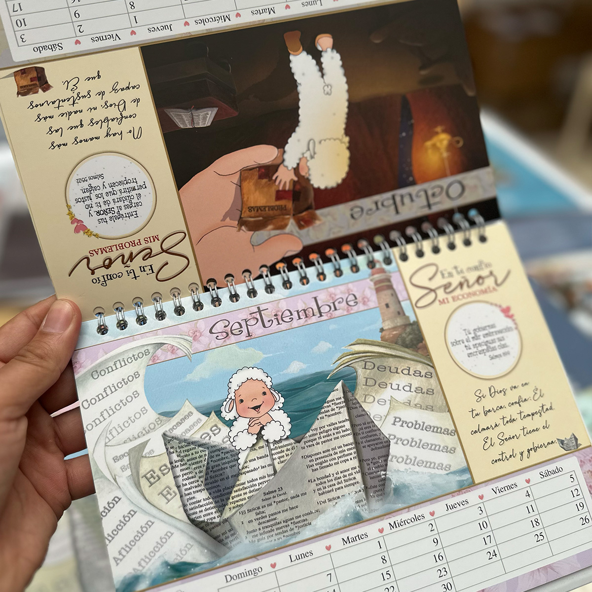 Con un diseño único y encantador, este calendario presenta ilustraciones especiales de ovejitas que transmiten paz, dulzura y esperanza. Cada mes incluye una portada distinta, un versículo bíblico, un comentario edificante y un calendario programador mensual. Además, incorpora un calendario miniatura del mes siguiente, lo que lo convierte en una opción ideal para planificar con anticipación.