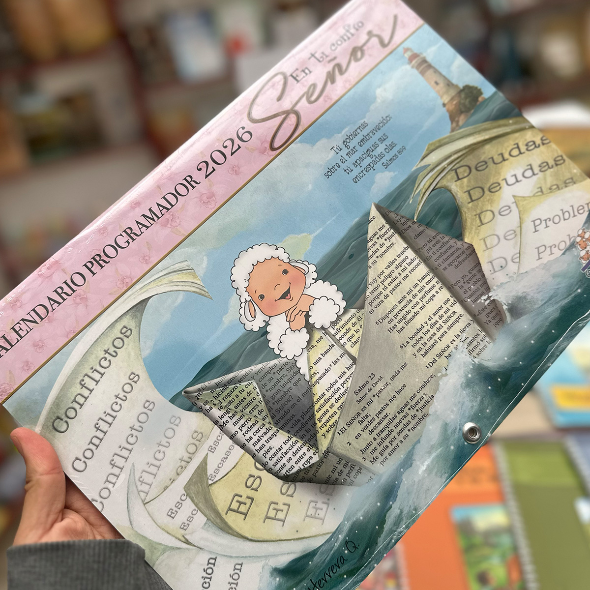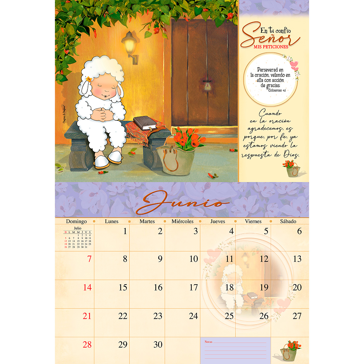 Cada mes incluye una encantadora ilustración con ovejitas, acompañada de un título especial, un versículo bíblico y un comentario devocional que aporta esperanza y dirección. Con espacio diario para anotar tus actividades y propósitos, este calendario es ideal para quienes desean mantener el orden sin perder la inspiración. Su diseño brillante, alegre y lleno de color crea un ambiente acogedor que transmite paz y ánimo en cada página.