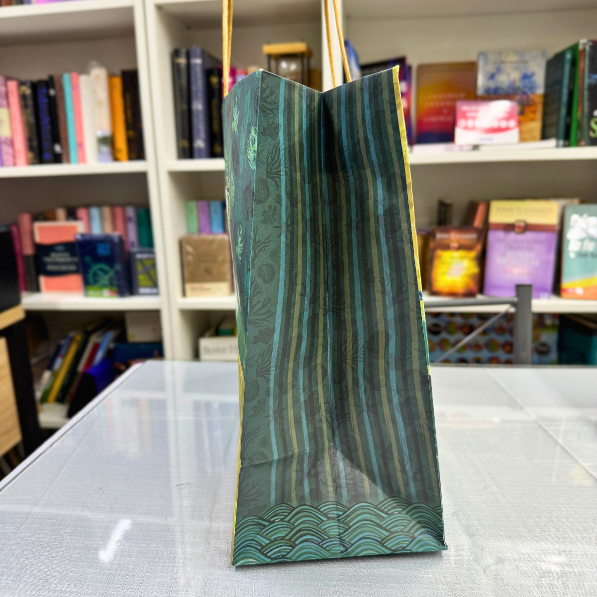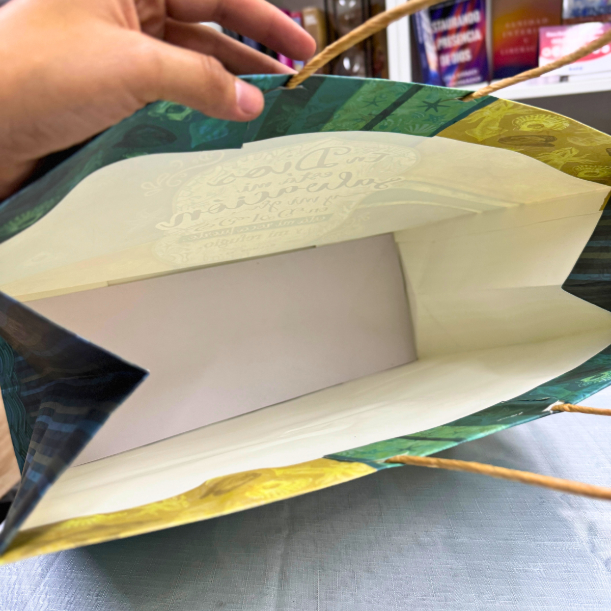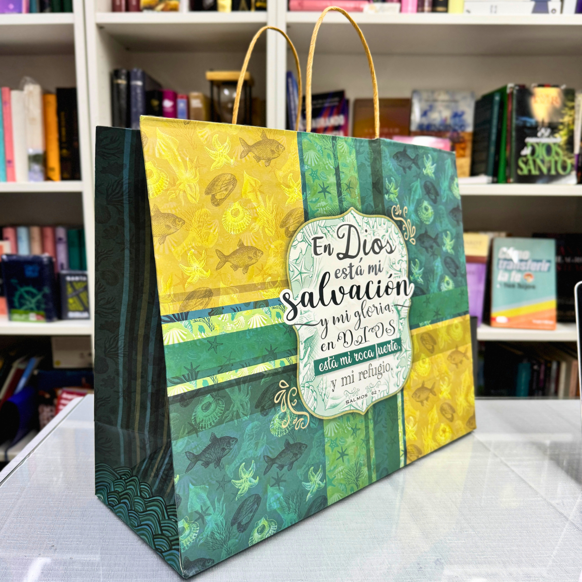 Una bolsa de regalo cristiana con un diseño elegante y profundo, ideal para acompañar obsequios con un mensaje de fe, confianza y esperanza en Dios. Su combinación de tonos verdes y amarillos, junto a ilustraciones sutiles inspiradas en la naturaleza y el mar, transmiten calma, fortaleza y refugio.