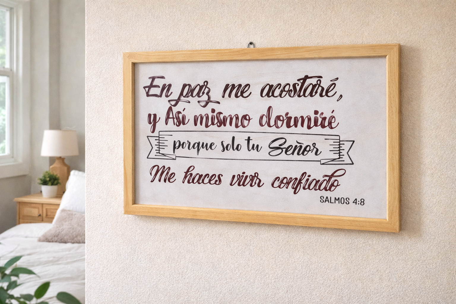 Su diseño elegante con marco en madera natural resalta la calidez del mensaje, haciéndolo ideal para habitaciones, salas, espacios de oración o incluso para regalar a alguien especial que necesite una palabra de paz.
