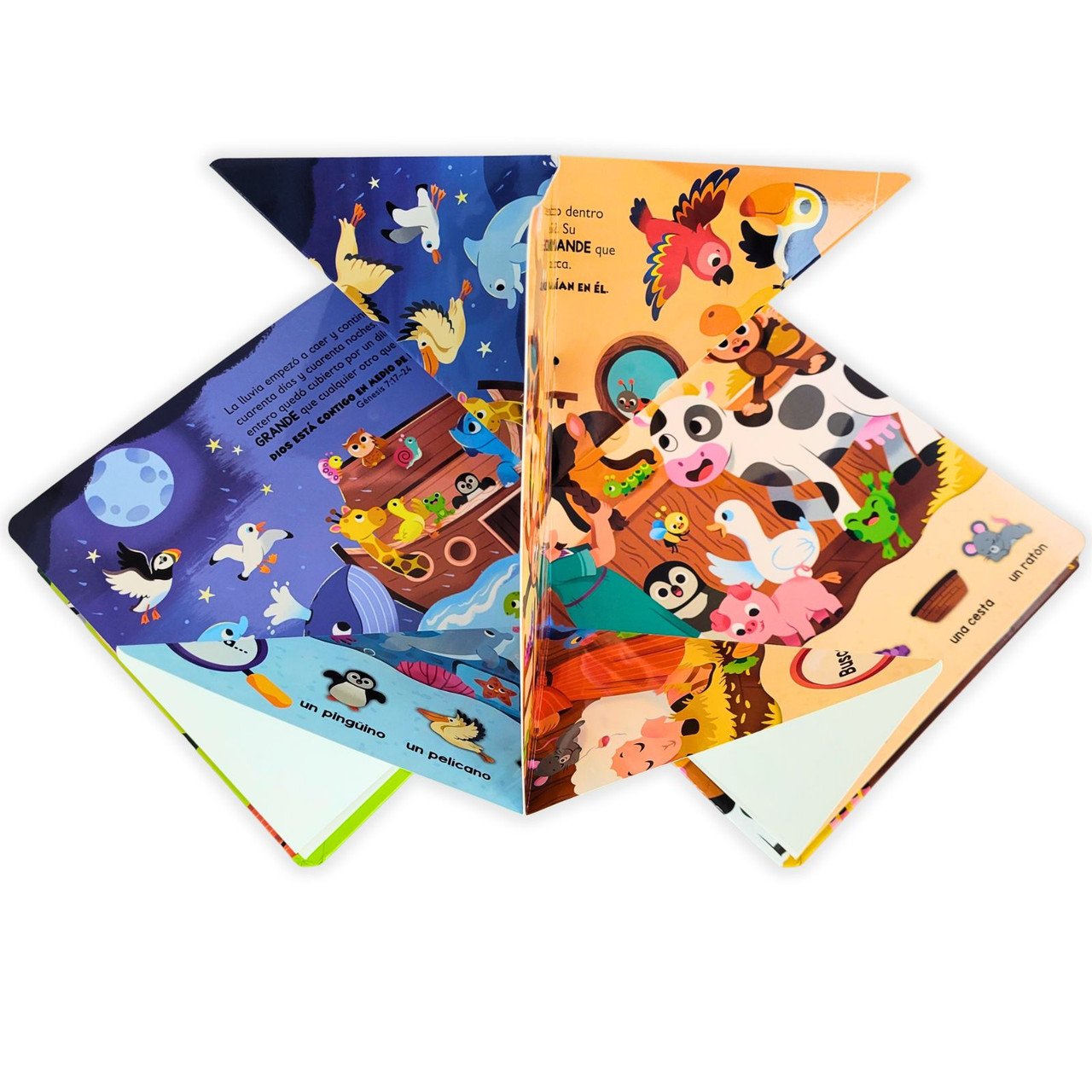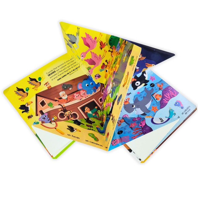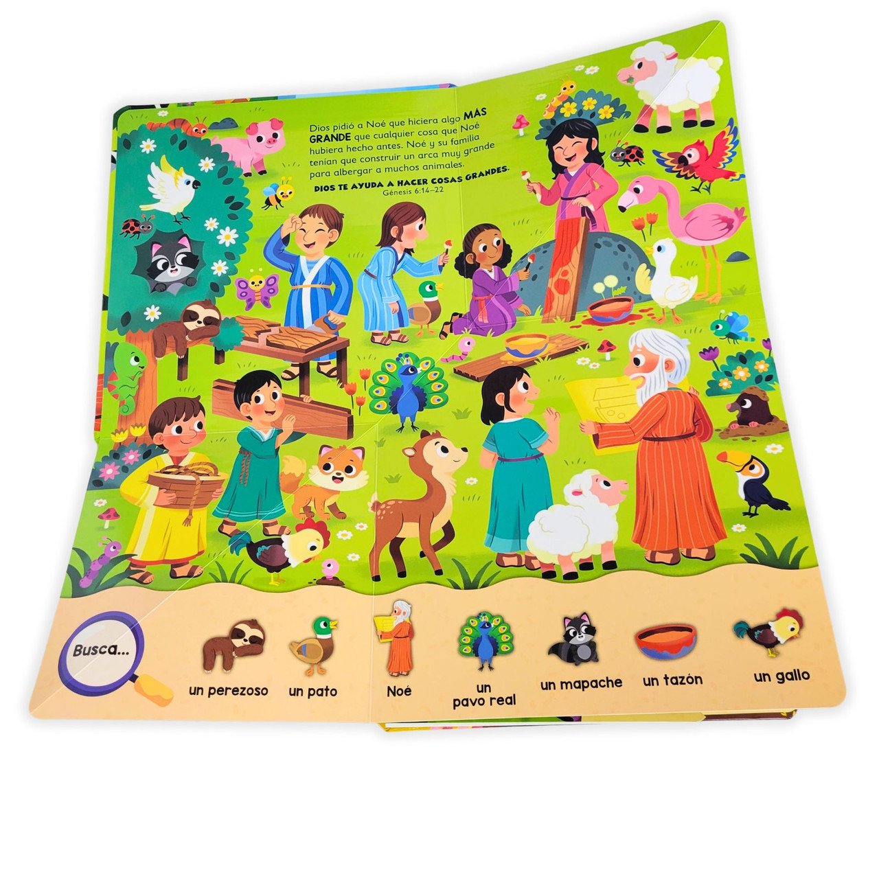 Mi arca de Noé más grande para buscar y encontrar es un libro infantil cristiano diseñado para transformar la lectura en una aventura visual interactiva.