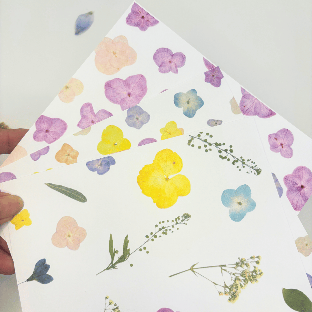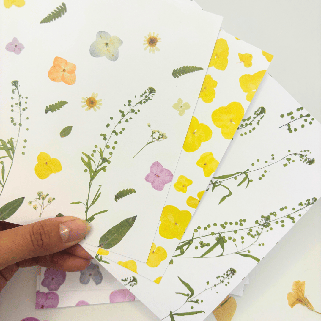 Este set incluye 10 diseños diferentes de papel con estampados inspirados en flores prensadas reales 🌿🌼