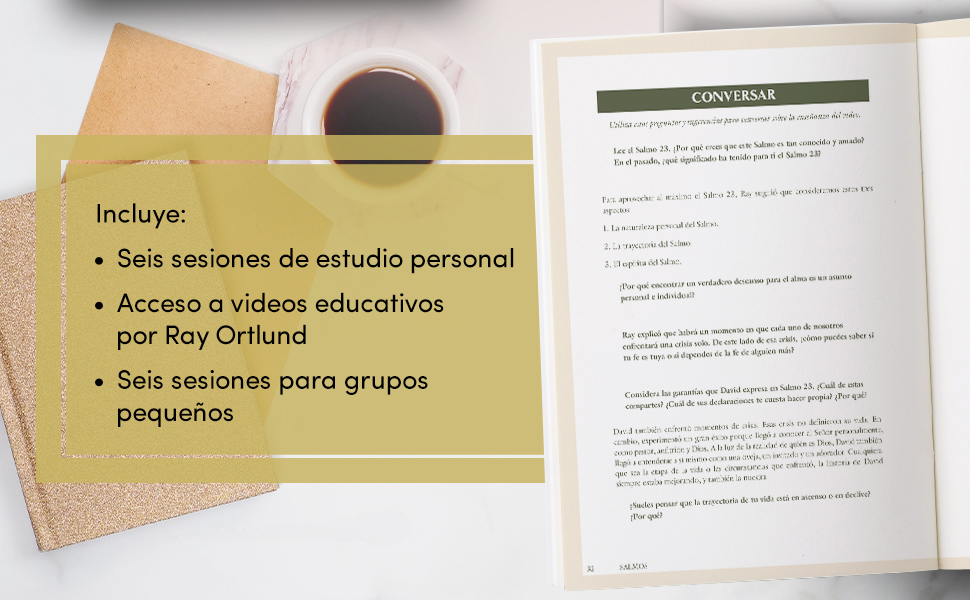 Salmos incluye contenido impreso para seis sesiones, estudio personal entre sesiones grupales, Escritura aplicable, «Cómo usar este estudio» y consejos para liderar un grupo. Además, cada libro contiene un código único que te permite acceder a videos de enseñanza gratuitos para cada sesión.