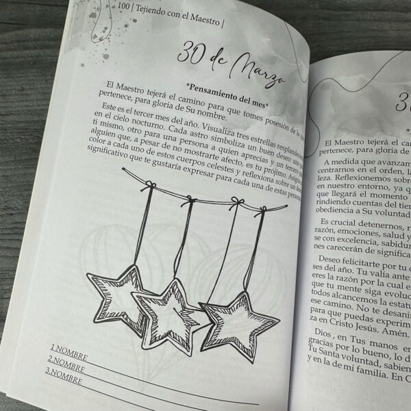 Tejiendo con el Maestro es un devocional diseñado para toda la familia, ofrece 365 días de enseñanzas espirituales, ejercicios mentales, imágenes para colorear y desafíos de inteligencia emocional. A través de un recorrido por toda la Biblia, este devocional pone énfasis en la salud mental, el crecimiento integral y la creación de momentos de calidad en el hogar. Además, incluye preguntas profundas de autoconocimiento, con el objetivo de hacer de este año un tiempo muy especial en el que anhelemos glorificar el nombre de Dios con nuestra vida.