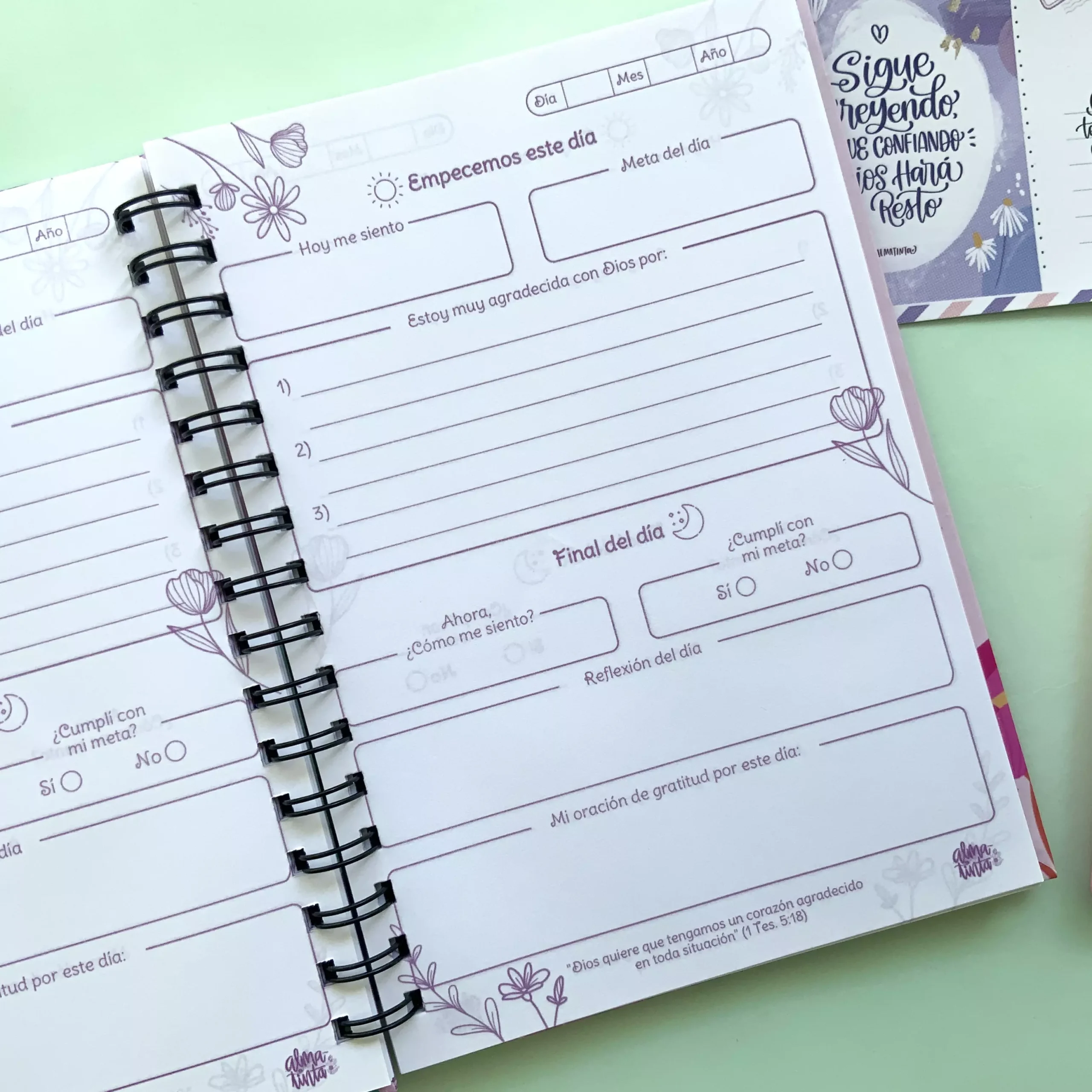 Este diario te ayudará a comenzar el día agradeciendo a Dios por tres bendiciones específicas, escribir cómo te sientes y establecer una meta importante para tu jornada. Al finalizar el día, podrás reflexionar sobre lo vivido, identificar lo que aprendiste y cerrar con una oración de gratitud a Dios.